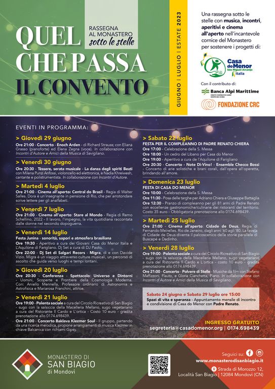 Il Monastero di San Biagio di Mondovì è lieto di presentare "Quel che passa il Convento - Rassegna al Monastero sotto le stelle", una serie di eventi culturali e artistici che si terranno dal 29 giugno al 29 luglio. Questa rassegna offre una varietà di spettacoli che spaziano dalla musica classica al cinema, dalle conferenze ai dj set, passando per la gastronomia del territorio per offrire al pubblico un'esperienza coinvolgente e unica. Gli eventi sono realizzati grazie al sostegno della Fondazione CRC e della Banca Alpi Marittime, e tutto il ricavato andrà a sostegno dei progetti di Casa do Menor in Brasile, Guinea-Bissau e Italia. Il Monastero aprirà le sue porte, in occasione degli eventi, a partire dalle 20, per chi volesse godersi la serata con le nostre birre e i nostri cocktail. In alcune serate sarà possibile fare aperitivo o cena a partire dalle 19.