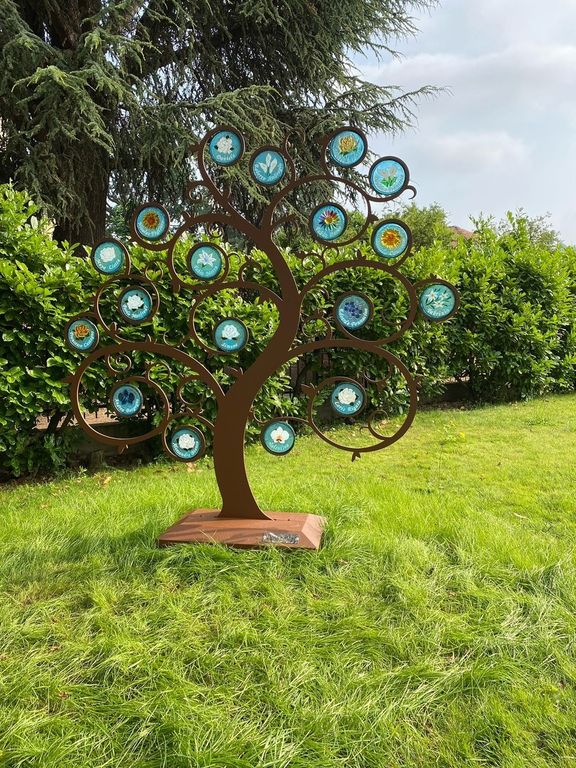 Un albero di luce con bellissimi fiori, ognuno a rappresentare un figlio, una figlia, unici e irripetibili, ora nell’eternità infinita che separa e unisce in un abbraccio senza confini. Così con Fabio ci sono allora Nicolas, Daniele, Edoardo, Andrea, Simone, continuando con Paolo, Roberto, Fabrizio, Alessandra, Valentina, il piccolo Loris, i fratelli Davide e Francesco, e poi ancora Fabio, Mattia, Francesco, la piccola Maya, celebrati ciascuno con una rosa, un giglio, un girasole, una stella alpina, una margherita, o una calla, incastonati nel riflesso limpido del vetro che ricorda la trasparenza della loro anima agli occhi di Dio, che colpita dalla luce divina riflette la variegata bellezza dei colori che si fondono con la natura che li circonda.