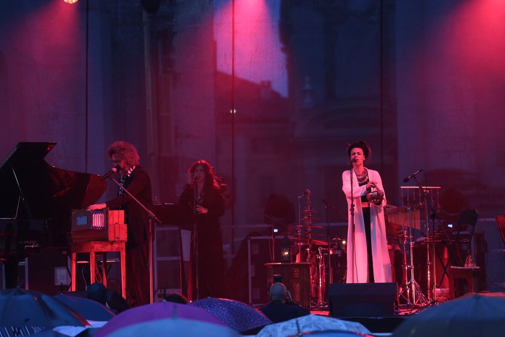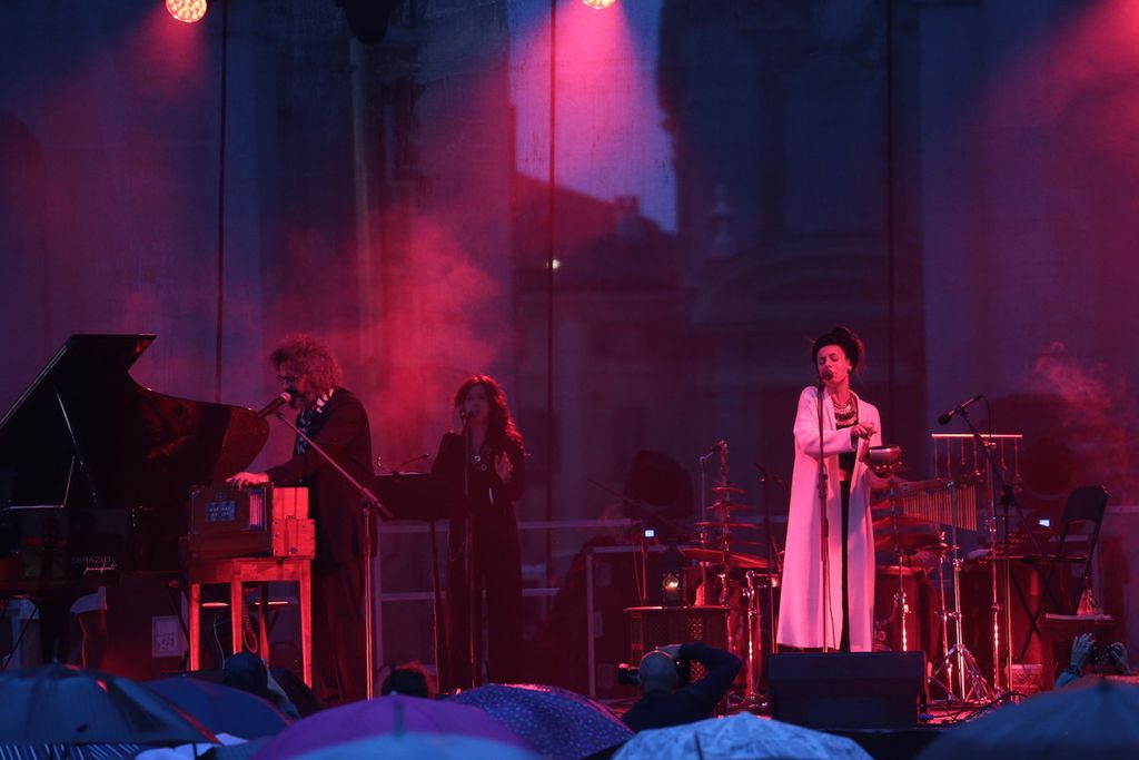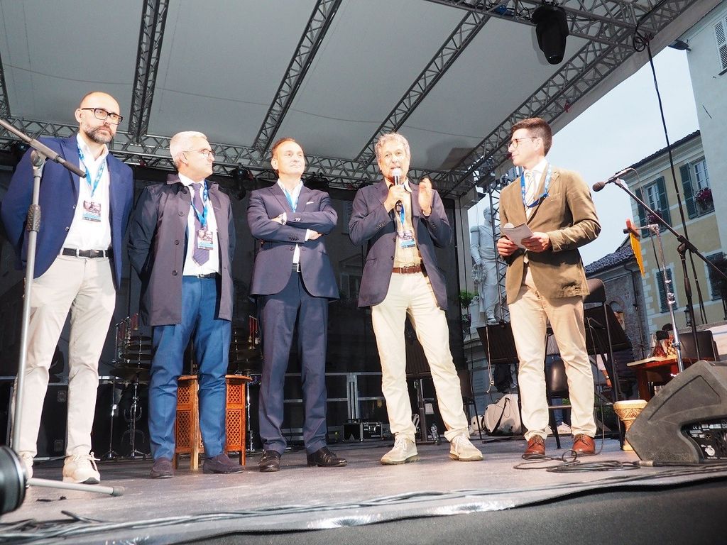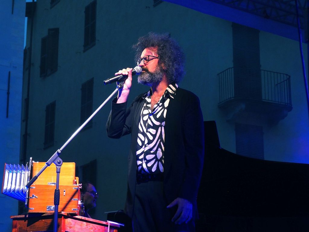 Poi sul palco è cominciata la musica, mentre il temporale si faceva fitto. Le prime note "mistiche" di Franco Battiato e poi il ritmo de "L'era del cinghiale Bianco" al termine della quale è tornato il sereno. Via gli ombrelli e spazio al tributo al cantautore siciliano scomparso nel 2021 nell'evento organizzato da Confartigianato Cuneo nell'ambito della rassegna Esperienze Artigiane sul palco.