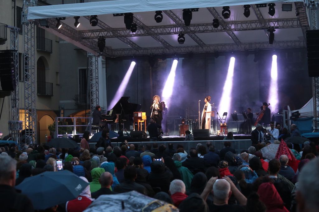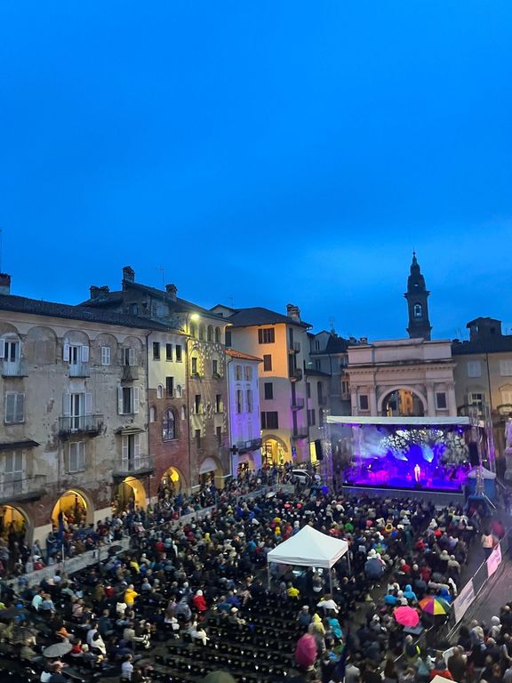 La pioggia battente all'inizio del concerto di Simone Cristicchi e Amara in programma ieri, giovedì 29 giugno, in piazza Santarosa a Savigliano, ha costretto a ridurre al minimo i saluti istituzionali. Alcuni hanno resistito sotto il palco con ombrelli aperti e impermeabili. Molti hanno cercato riparo sotto i portici.