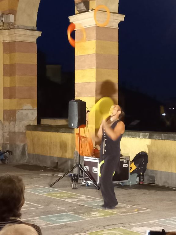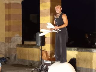 Stupore per grandi e piccini che, ad un certo punto, hanno preso parte ad un numero assolutamente eccezionale: dopo aver scelto otto spettatori ed averli fatto prendere confidenza con il gioco del tiro alla fune, Mr Gera ha camminato su quest’ultima tenuta in tensione, esibendosi in numeri di straordinaria giocoleria con oggetti infuocati. All’apice della performance, la combinazione di equilibrio su una grossa sfera, giocoleria con le clave e una scopa sul mento.