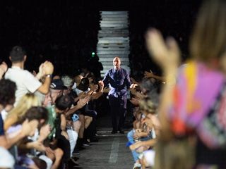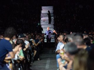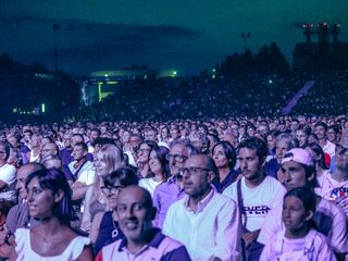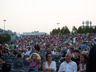 Tutto esaurito in termini di posti per una piazza trasformata per una sera in un enorme teatro, con posti a sedere numerati e una tribuna al fondo della piazza.