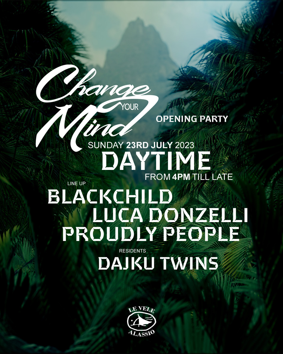 Per godersi la meravigliosa location anche di giorno, domenica 23 luglio dalle ore 16:00 ci sarà l'opening party del Daytime di Change Your Mind. Anche questa volta il programma della giornata è entusiasmante grazie agli ospiti internazionali Blackchild, Proudly People, Luca Donzelli e resient djs Dajku Twins. Entro le ore 17:00 per le persone segnate in lista online l'ingresso sarà libero, facoltativa la consumazione.