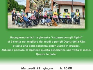 Su iniziativa del Gruppo Alpini di Margarita, è nata un’attività di solidarietà, che si ripete di mese in mese, nel corso dell’estate 2023, alternato mattine e pomeriggi in collaborazione con i volontari dell'associazione Margarita attiva e solidale ed alle assistenti e collaboratrici della casa di accoglienza per anziani di Margarita, accompagnando gli ospiti della struttura in passeggiate e uscite sul territorio locale. Giovedì 20 luglio, in particolare, è stato visitato il parco del Castello della Margarita, ed insieme alla contessa-giardiniera Lucia Ruá, sotto l'ombra di alberi secolari, sono state ascoltate le storie del palazzo nobiliare. Tutti gli ospiti ed accompagnatori sono rimasti affascinati dall'atmosfera che il luogo trasmette, anche se la mattinata è passata molto velocemente.