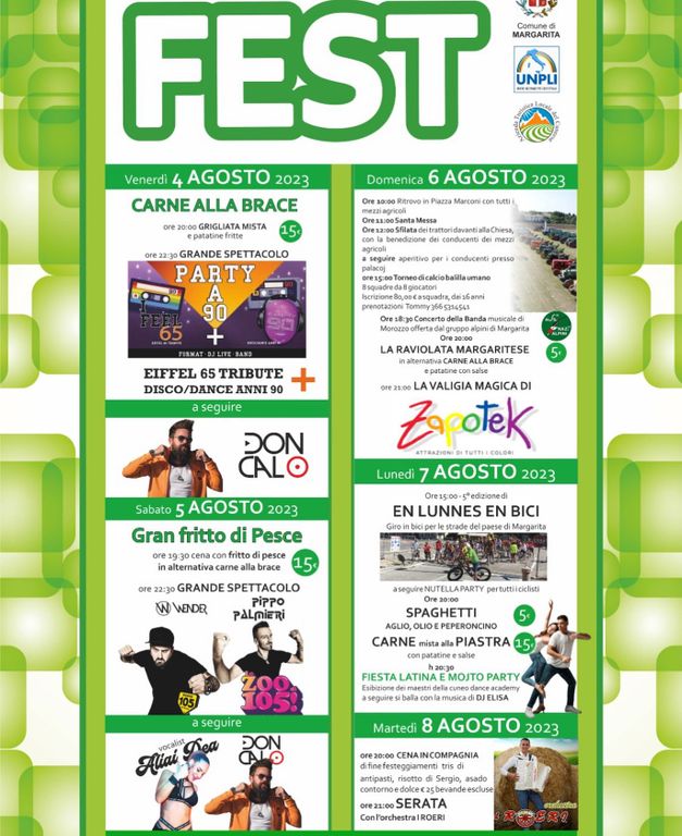 Venerdì 4 agosto: alle 20 carne alla brace, a seguire diverimento con il party anni '90 con Elemento 90 + "Eiffel 65 Tribute".