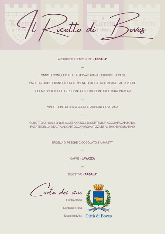 Spiega l’assessore Raffaella Giordano: “La nostra grande cena del Ricetto ha una storia di oltre 30 anni alle spalle. Nacque su iniziativa dell'allora assessorato all'Agricoltura e la sezione femminile bovesana della Coldiretti, all'epoca Donne Rurali, oggi Donne Impresa, per celebrare la grande tradizione culinaria del nostro territorio. Una tradizione contadina alla quale siamo molto legati. Non solo gastronomia quindi ma valori profondi di una popolazione la cui forza d’animo, volontariato e la buona volontà non sono mai mancati”.