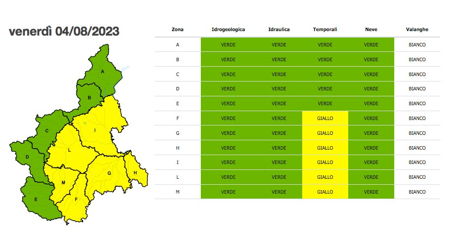 Questa la situazione prevista a partire dalle prossime ore su buona parte della Granda, per la quale è stata diramata un'allerta GIALLA.