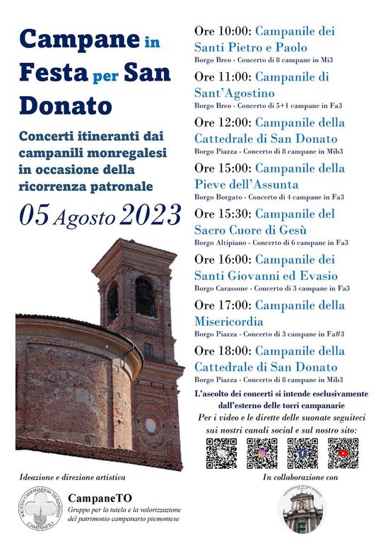 Domani, sabato 5 agosto, a Mondovì andrà in scena la terza edizione del "Campane in Festa per San Donato", un'iniziativa ideata da CampaneTo, gruppo per la tutela e la valorizzazione del patrimonio campanario piemontese, cui è affidata anche la direzione artistica dell'evento.