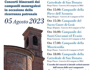 Domani, sabato 5 agosto, a Mondovì andrà in scena la terza edizione del "Campane in Festa per San Donato", un'iniziativa ideata da CampaneTo, gruppo per la tutela e la valorizzazione del patrimonio campanario piemontese, cui è affidata anche la direzione artistica dell'evento.