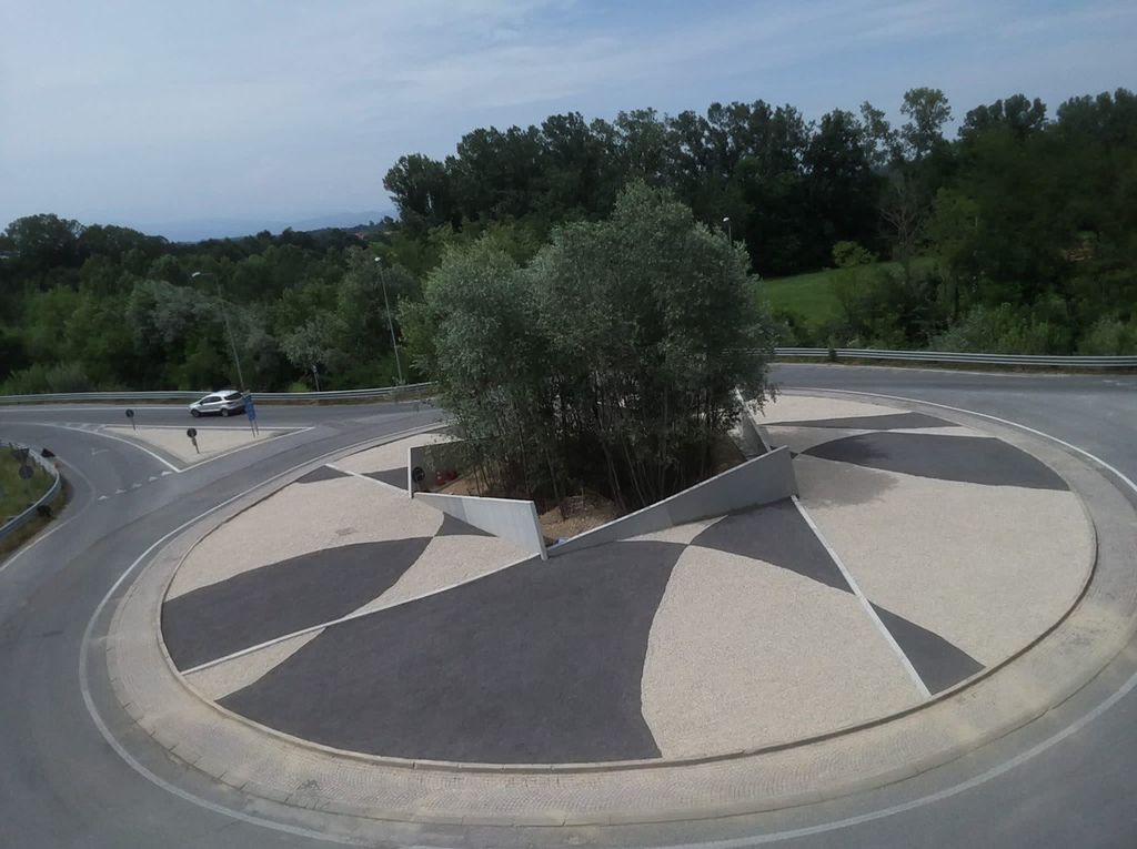 L'intervento, su progetto dell'architetto Giampiero Danni, ha previsto la creazione di un'installazione attorno alla vegetazione preesistente al centro della rotatoria; nello specifico sono state posizionate delle pareti prefabbricate di produzione dell'AR3, con l'intento di richiamare le montagne del Cuneese. Infine il contorno è stato completato con ghiaia di due tonalità per creare un gioco di colori.