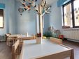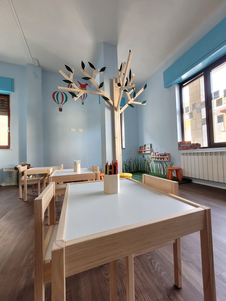 Ci sono alberi colorati dipinti sui muri, uccellini, scarpiere e bagni a misura di bimbo. Ovunque colori, libri, morbidi tappeti, lettini per la nanna e seggioloni.