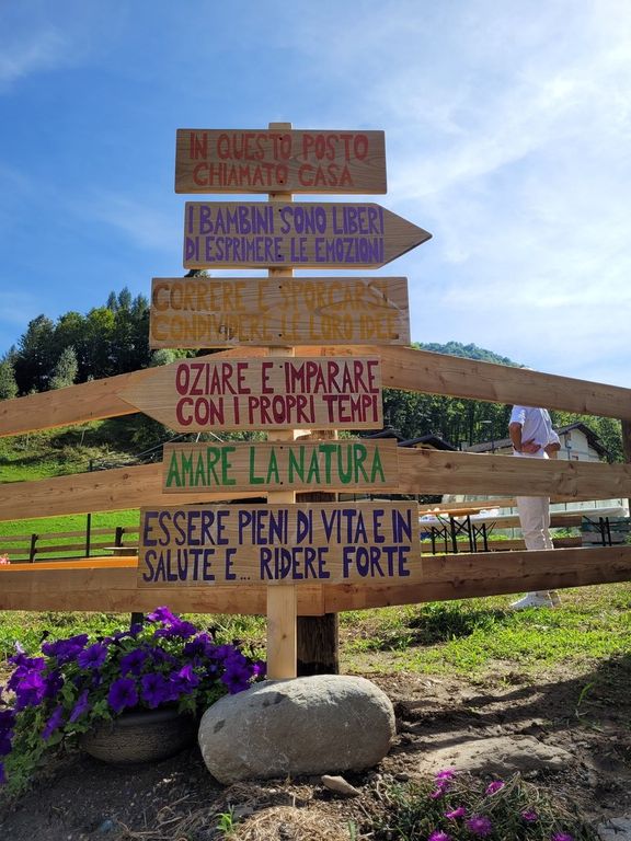 Tutto questo è sintetizzato nel cartello colorato all’entrata dell’area esterna, adiacente alla casa, dove c’è scritto: “In questo posto chiamato casa i bambini sono liberi di esprimere le emozioni, correre e sporcarsi, condividere le loro idee, oziare e imparare con i propri tempi, amare la natura, essere pieni di vita e in salute e… ridere forte!!!.