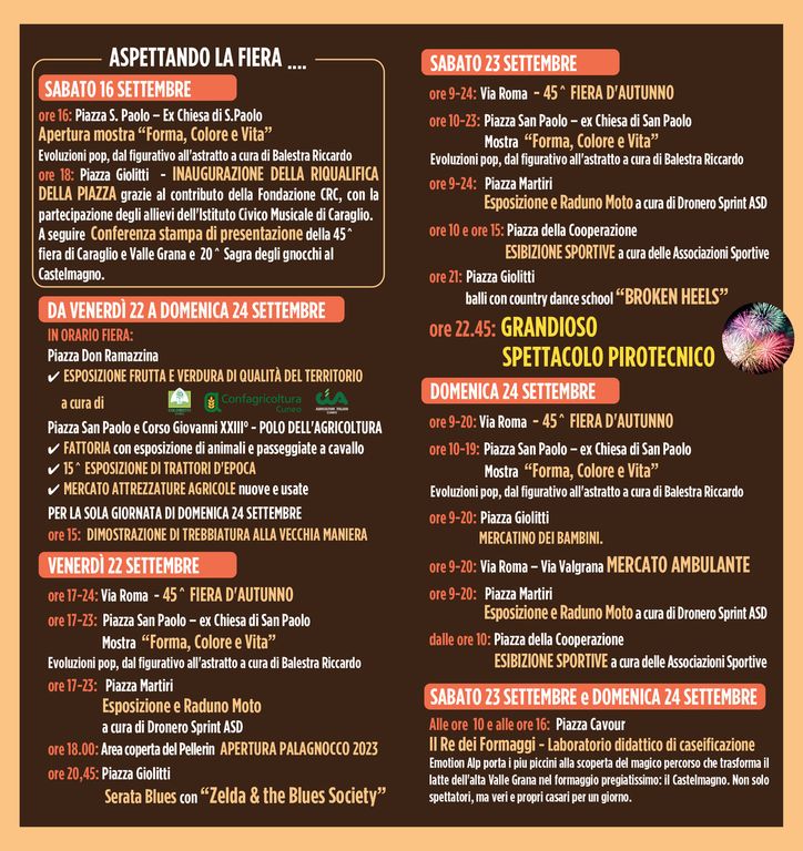 Puntuale come ogni anno ritorna, alla sua quarantacinquesima edizione, la Fiera d'Autunno di Caraglio e Valle Grana che si svolgerà da venerdì 22 a domenica 24 settembre a Caraglio. Come ogni anno saranno oltre 300 le bancarelle presenti in fiera, con proposte che andranno dall’eccellenza artigiana, a quella alimentare e al polo dedicato all'agricoltura, dando spazio a aziende locali e non.