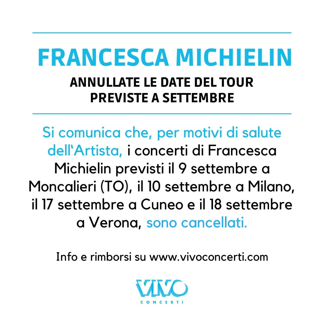 L'annuncio con questa nota: "Per tutti coloro che hanno acquistato in prevendita il biglietto per il concerto, che era previsto il 17/09, riceveranno una comunicazione da Mail Tiket (www.mailticket.it) per ottenere il rimborso. Tutto lo staff dell’Associazione culturale All4U Abbraccia forte Francesca e le augura una pronta guarigione. Nelle prossime ore presenteremo tutto il programma dettagliato della kermesse; siamo certi che nonostante la cancellazione del concerto di domenica 17 sarà una edizione strabiliante e non mancheranno le sorprese e i colpi di scena!"