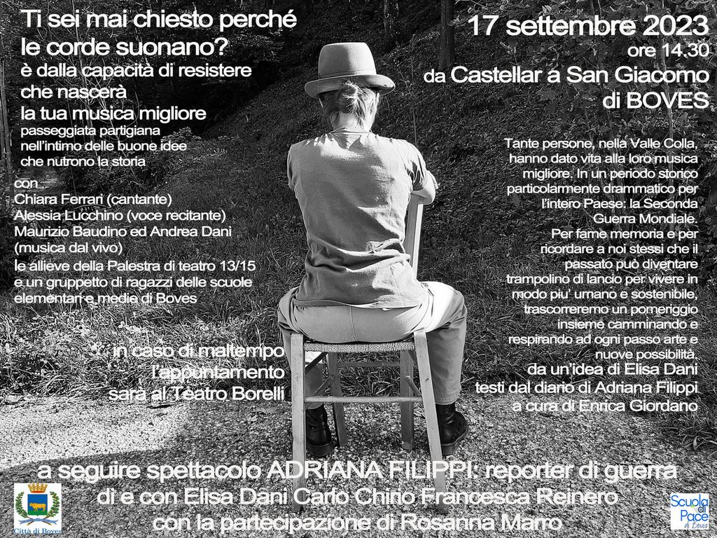 Partenza domenica 17 settembre ore 14.15 dalla stele partigiana a Castellar, arrivo a San Giacomo alle ore 16.00. A seguire spettacolo teatrale in ricordo di Adriana Filippi, reporter di guerra. Regia, testi e voce di Elisa Dani, immagini e Kamishibai Francesca Reinero, contrabbasso live Carlo Chirio