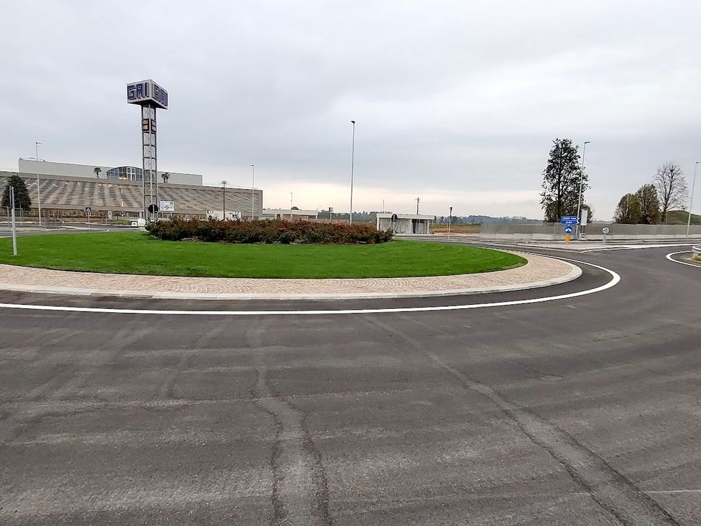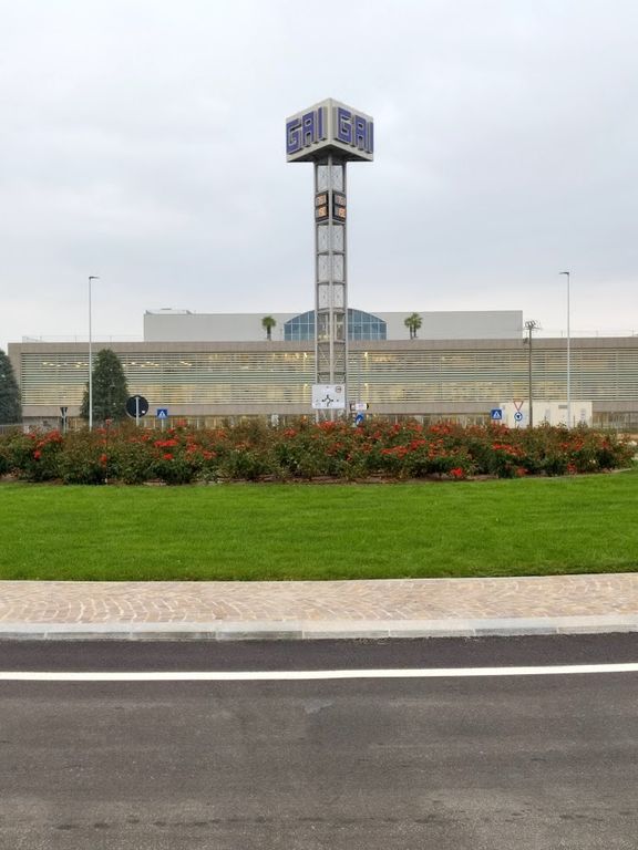 Al centro di una delle due rotatorie è stata posizionata una colonna in acciaio alta 27 metri, con il nome Gai sulla sommità e le indicazioni di ora e temperatura. Finiture delle aiuole in porfido e pietra di Luserna, piazzale con servizi igienici e docce a disposizione degli autotrasportatori, tavoli per consumare i pasti e collegamento diretto con la portineria, completano un’opera molto curata e funzionale.