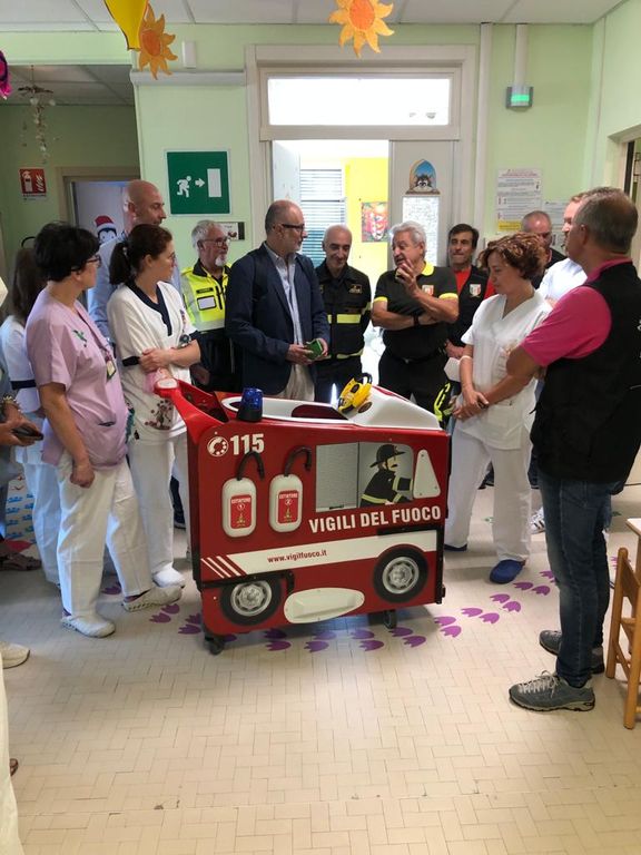Nella mattinata di ieri (giovedì 14 settembre) è stata consegnata all'ospedale S. Croce di Cuneo, nel reparto Pediatria, "l'autobotte in corsia". Nata da un'idea dei vigili del fuoco di Catania, dall’ex Comandante Bennardo, e sviluppata dall'associazione nazionale Vigili del Fuoco di Cuneo in collaborazione con il Comando Provinciale, la sua realizzazione è stata possibile grazie al finanziamento della Fondazione CRC di Cuneo e all'impegno della Metalresine di Caraglio (per la scocca in resina), Publitalia Cuneo (per le serigrafie), Massucco di Verra Fulvio (per i componenti) e Plastimark di Caraglio (per il carrello di allestimento).