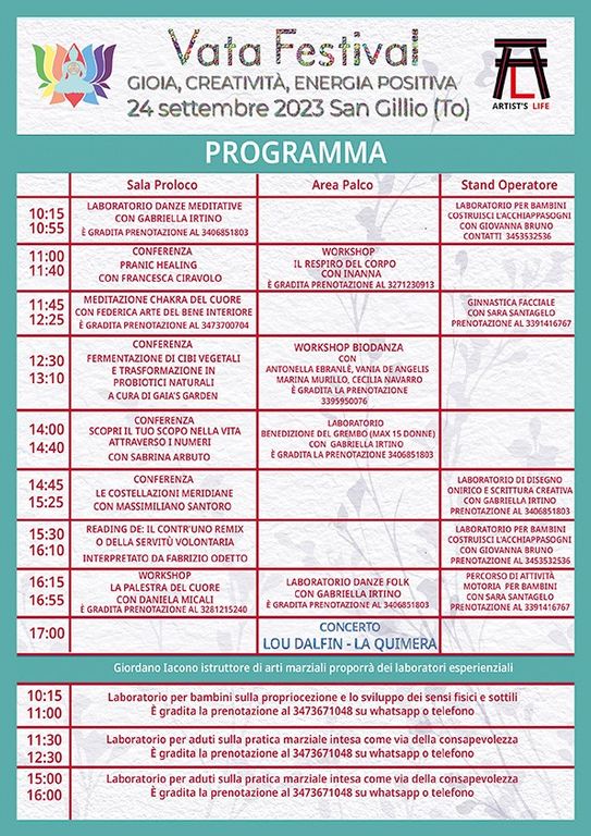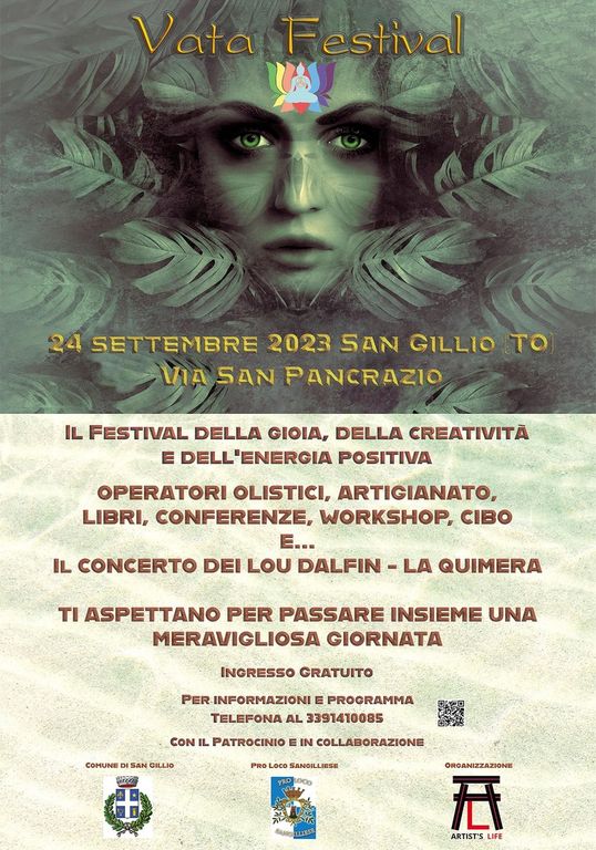 L’evento inizierà alle 10 con il saluto di benvenuto da parte delle autorità e proseguirà fino alle 19 con il Patrocinio del Comune di San Gillio e in collaborazione con la Pro Loco Sangilliese. Il Vata Festival è una giornata all’insegna del benessere, della gioia, della creatività e della cultura. Un’occasione per praticare discipline olistiche e per conoscere nuove realtà e prodotti artigianali.