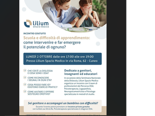 In occasione della Settimana Nazionale della Dislessia, Lilium Spazio Medico organizza un incontro per aiutare i ragazzi e le loro famiglie a capire meglio come gestire gli effetti della dislessia e come riconoscerla. L'appuntamento è previsto per domani, lunedì 2 ottobre, dalle ore 17 alle ore 19 presso Lilium Spazio Medico in via Roma, 62.