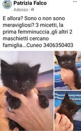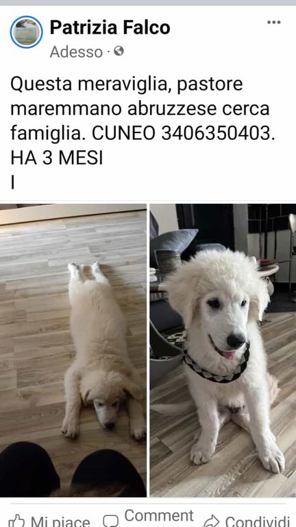 Gattini, gatti, ma anche cuccioli di cane. Da alcuni giorni sono segnalati tre cagnolini nati in una borgata sperduta in montagna, adottabili dai primi di novembre, come un piccolo meraviglioso di maremmano abruzzese, di tre mesi, stallato a Cuneo, in cerca di famiglia.