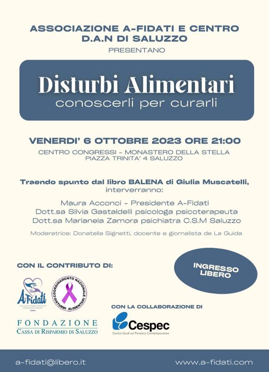 La conferenza, ad ingresso libero, è organizzata da “A-Fidati” di Cuneo (associazione familiari di persone con disturbi del comportamento alimentare) e dal Centro per i disturbi dell'alimentazione e nutrizione (Dan) di Saluzzo, in collaborazione con il Centro studi sul pensiero contemporaneo(Cespec) e il sostegno della Fondazione Cassa di Risparmio di Saluzzo.