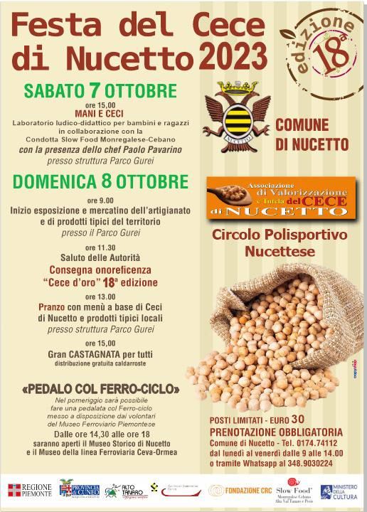 Alle ore 13.00 vi delizieremo col pranzo a base di Ceci di Nucetto e prodotti tipici locali (pranzo per il quale è necessaria la prenotazione, contattando il numero: 017474112 o via WhatsApp al numero 3489030224).