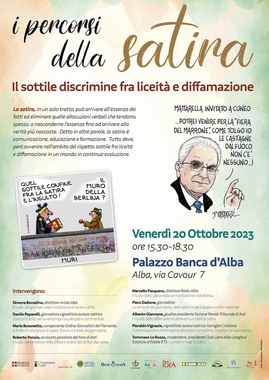 Ne parleranno, in qualità di relatori, Danilo Paparelli, direttore di "Dogliani e la sua Langa", Pieraldo Vignazia, vignettista di “Famiglia Cristiana”, Simona Borsalino, direttrice della rivista "Idea", Marcello Pasquero, direttore di "Radio Alba", il giornalista, coideatore degli "Uomini di Mondo", Piero Dadone, l’avvocato, Roberto Ponzio, penalista albese, per gli aspetti propriamente giuridici e di salvaguardia della libertà di critica e il giudice presidente della sezione penale del Tribunale di Asti, Alberto Giannone.