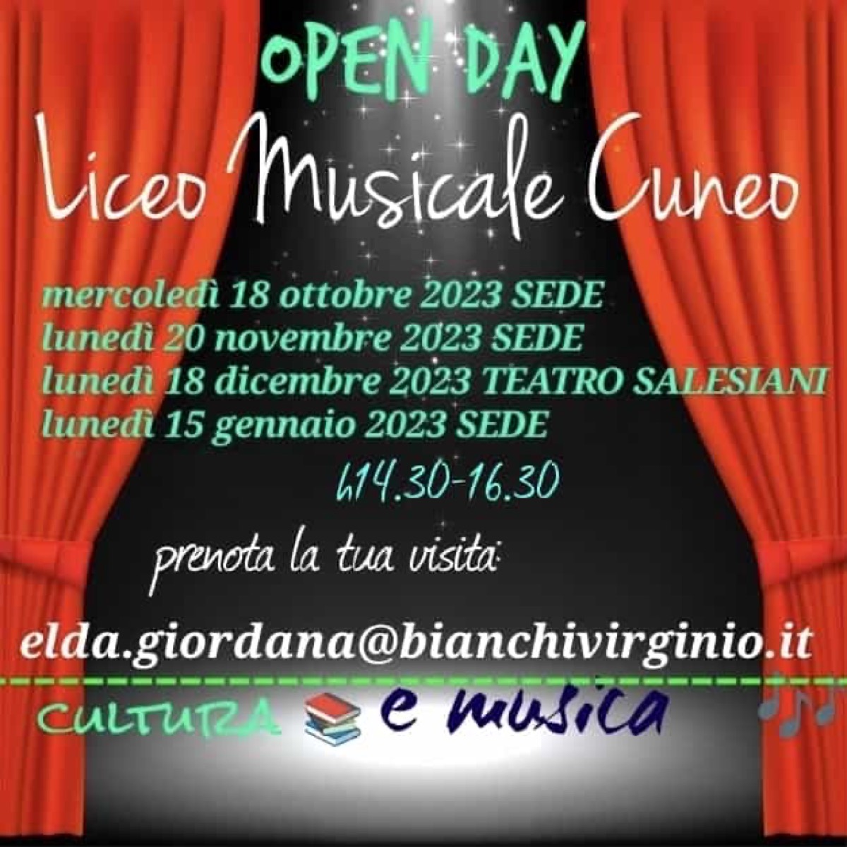 Per conoscere meglio il Liceo, i docenti, gli allievi e ascoltare le loro esibizioni è sufficiente partecipare a una delle giornate di scuola aperta previste nei prossimi mesi. La prima sarà mercoledì 18 ottobre, mentre le successive sono in programma per lunedì 20 novembre e lunedì 15 gennaio entrambe in sede in corso De Gasperi dalle ore 14.30 alle 16.30