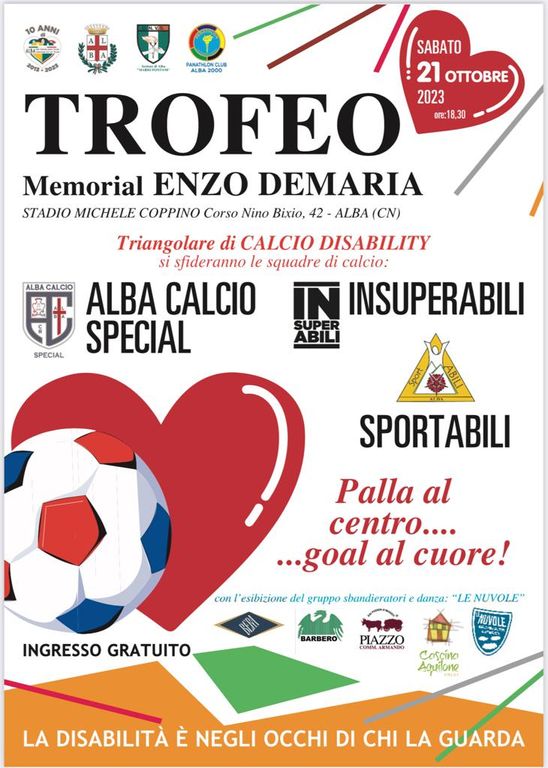 L'appuntamento è per sabato 21 ottobre alle ore 18.30 presso lo stadio Michele Coppino. Si sfideranno in un triangolare le squadre Alba Calcio Special, Insuperabili e Sportabili. Lo slogan della manifestazione è "Palla al centro, goal al cuore", l'ingresso è libero.