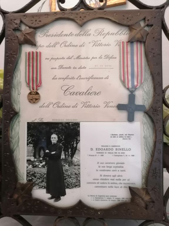Don Binello, nato a di Priocca nel 1885, non fu solo sacerdote, ma anche educatore e consigliere economico. Uomo di rara intelligenza, sensibilità e preveggenza era famoso per le sue prediche in cui descriveva, purtroppo a ragione, l’evoluzione negativa dell’Uomo. Venne insignito in occasione del 50° anno della 'Vittoria' del titolo di Cavaliere dell’Ordine di Vittorio Veneto, in quanto cappellano militare durante il primo conflitto mondiale.