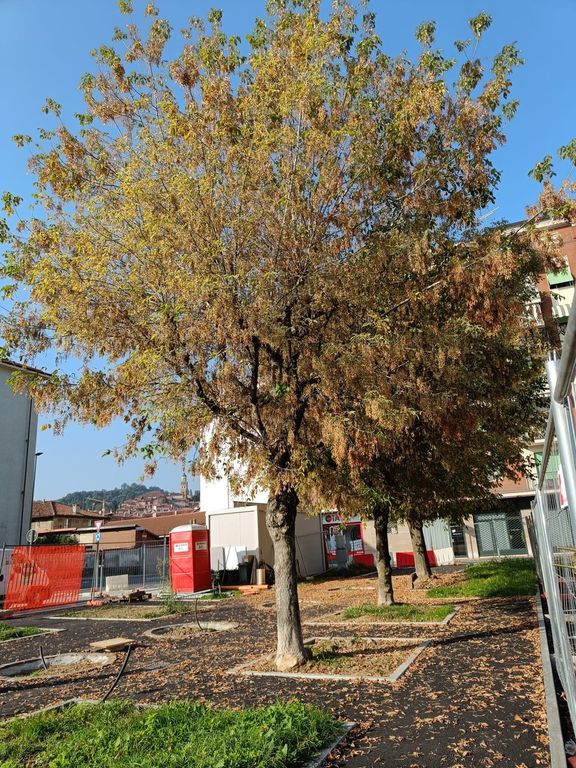 I tre aceri "bianchi "della piazzetta Battaglione Alpini, vicina alle Poste, in fase di riqualificazione, sono stati tagliati, ieri mattina, giovedì 12 ottobre.