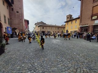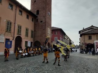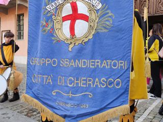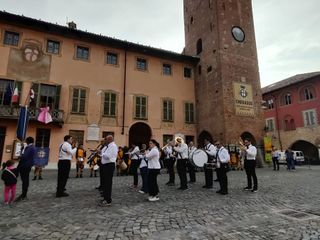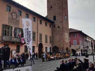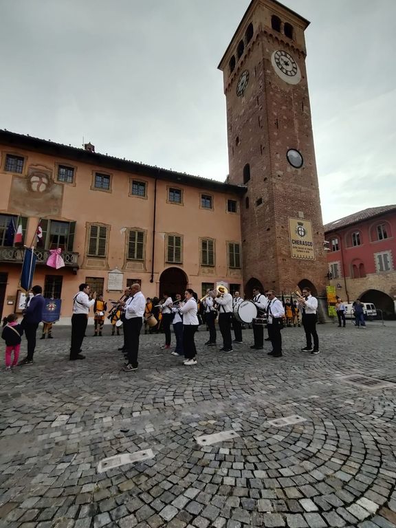 Spettacolare le esibizioni della Banda Musicale 'Mons. Calorio' e del Gruppo Sbandieratori Città di Cherasco, davanti alla torre del comune.