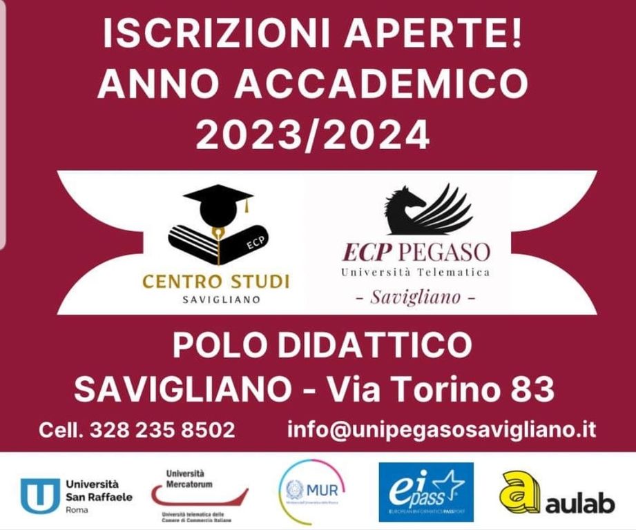 È attivo da qualche mese a Savigliano in Via Torino 83, il Polo didattico ufficiale Pegaso, Università digitale con offerta formativa molto ampia: 72 percorsi di laurea e più di 200 master anche in ambito sanitario. S. Raffaele, Mercatorum e Pegaso sono le tre Università che garantiscono la qualità' del nostro servizio (elenco delle facoltà consultabile sul sito www.unipegasosavigliano.it)