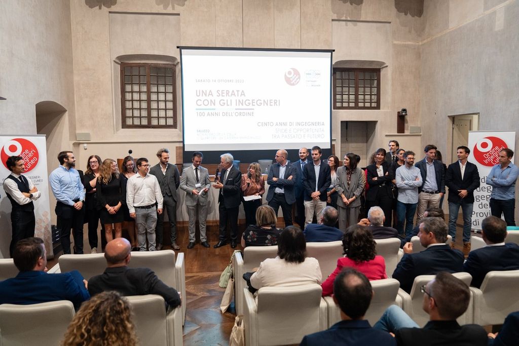 Oltre 350 partecipanti da tutta la provincia di Cuneo (e non solo), sei ore di dibattito sui temi di maggiore attualità e sulle prospettive future del settore, una grande festa conviviale che ha coinvolto professionisti e aziende del territorio. “Una Serata con gli Ingegneri” – evento promosso dall’Ordine degli Ingegneri della Provincia di Cuneo e giunto alla sua quarta edizione – ha fatto registrare un ottimo successo, celebrando peraltro un anniversario molto significativo: il centenario dell’Albo Nazionale degli Ingegneri. La ricorrenza – festeggiata alla presenza di una delegazione del Consiglio Nazionale degli Ingegneri (C.N.I.), guidata dal presidente Angelo Domenico Perrini – è stata il filo conduttore della manifestazione, che si è svolta sabato 14 ottobre a Saluzzo.