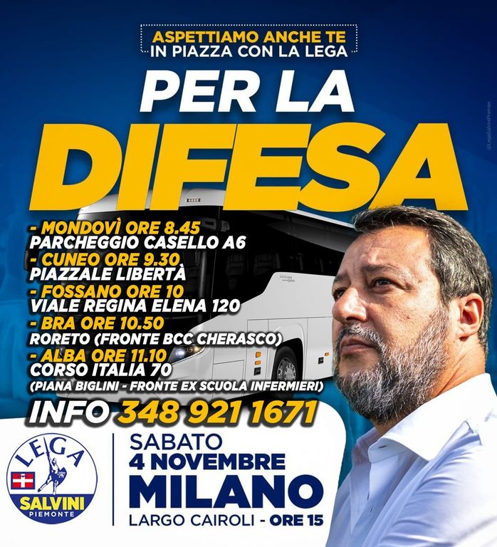 Nella giornata di sabato 4 novembre la Lega Salvini Premier della Provincia di Cuneo organizzerà la trasferta per partecipare alla manifestazione indetta a Milano in difesa della libertà, contro il terrorismo e l'antisemitismo.