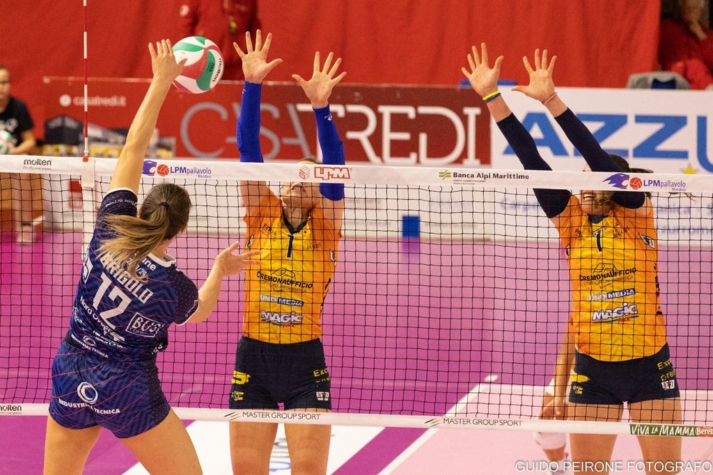PRIMO SET: partenza sprint per l'Esperia, avanti 2-5. Pumine in grande difficoltà, tanto che coach Gazzotti si spende il primo time-out dopo appena 5 minuti di gara. Cremona solida anche a muro. Ace di Sofia Turlà e ospiti a +5. Sul 9-15 arriva la seconda richiesta di time-out della panchina monregalese. Le pumine provano a superare il momento di difficoltà. Dopo un break di tre punti per la Lpm arriva il time-out di Zanelli sul 14-16. Gran lavoro in fase difensiva di Salì Coulibaly. Entra in campo anche Kristin Lux. Mondovì ritrova la parità sul 20-20. Valeria Pizzolato mette a terra il punto del 21-21, ma nel ricadere rimedia un infortunio al ginocchio ed è costretta a abbandonare il match. Sul 23-24 arriva un set-point per l'Esperia. Laura Grigolo annulla e si prosegue ai vantaggi. L'attacco out di Salì Coulibaly chiude il primo set sul 26-28.