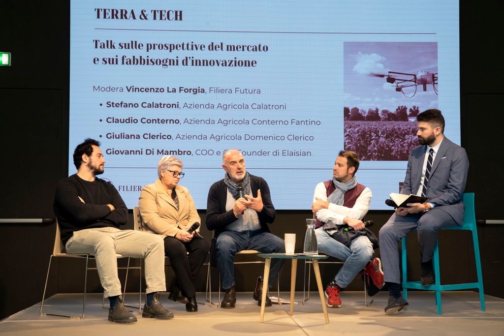 Nel corso dell’incontro di presentazione di Terra&Tech svolto a Milano, diversi rappresentanti del settore vitivinicolo hanno raccontato la propria esperienza professionale a cavallo tra un passato scritto e un futuro da immaginare, offrendo anche il proprio punto di vista sulle prospettive del mercato: tra loro Stefano Calatroni - Azienda Agricola Calatroni, Giuliana Viberti Clerico - Azienda Agricola Domenico Clerico, e Claudio Conterno - Azienda Agricola Conterno Fantino, insieme a Giovanni Di Mambro, Co-Founder e COO della startup Elaisian, che sviluppa servizi innovativi per la digitalizzazione delle aziende agricole.