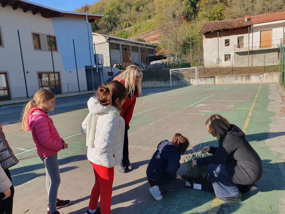 I piccoli accompagnati dagli insegnanti hanno messo a dimora delle piante di lavanda nel giardino della scuola che ospita entrambi i plessi.