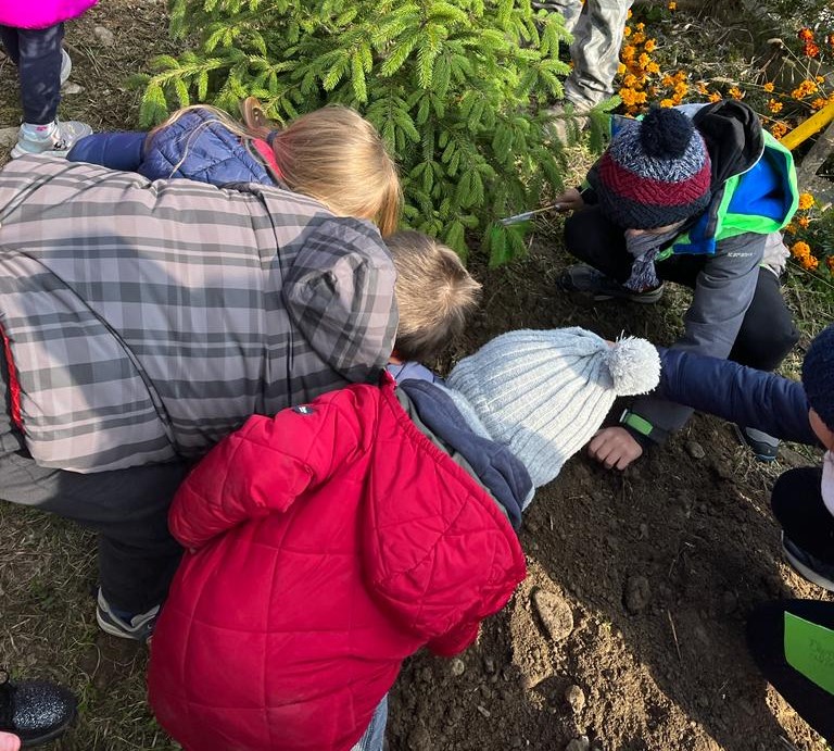 I piccoli hanno collaborato per coprire le zolle dei due pini che saranno addobbati ogni anno a Natale uno dalla scuola dell’infanzia e uno dalla scuola primaria di Pagno.