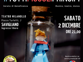 L’associazione Noi con Voi ODV è lieta di presentare una bella e coinvolgente serata di beneficienza. Sabato 2 dicembre p.v. presso il Teatro Milanollo (Piazza Turletti, 7, Savigliano) alle ore 21 si terrà lo spettacolo #TUTTIPICCOLIPRINCIPI. L’ingresso sarà libero con raccolta di offerte che saranno interamente destinate al progetto in cui l’associazione si sta impegnando maggiormente al momento.