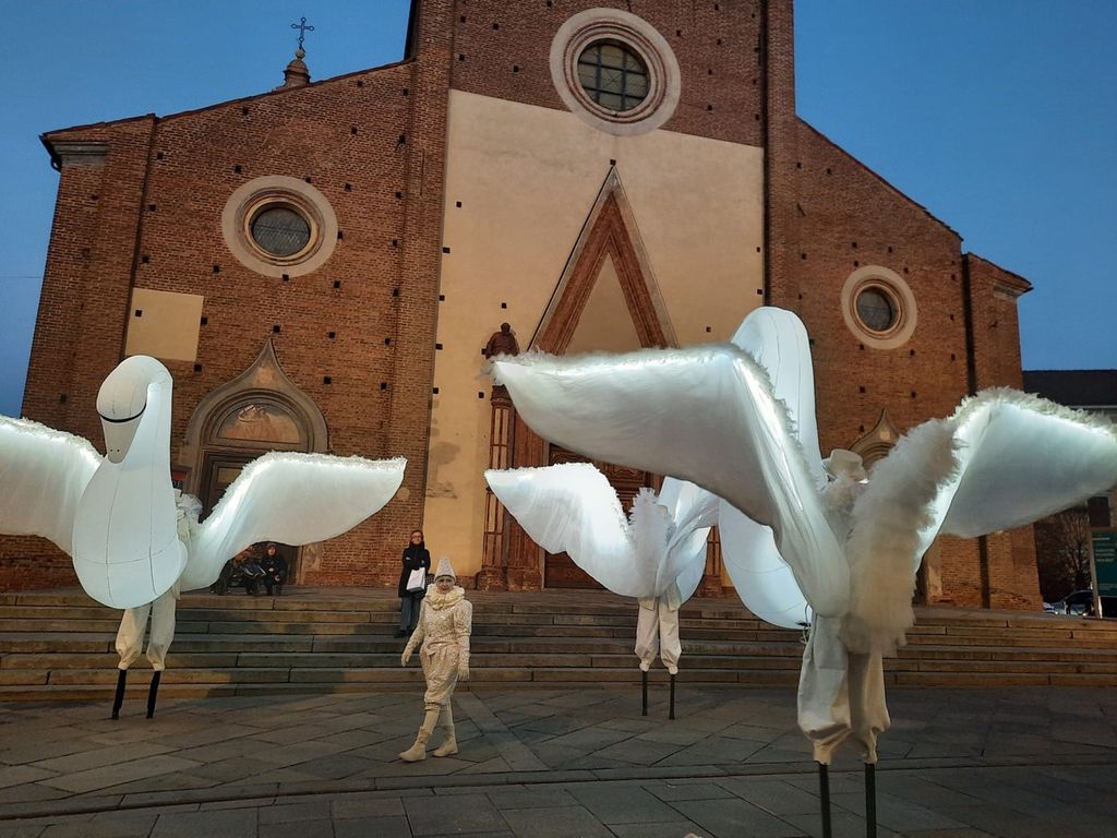 Tre candidi cigni giganti dall'andatura fluttuante, a suon di musica, hanno portato la poesia del Natale a Saluzzo.