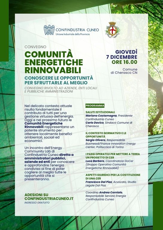 Giovedì 7 dicembre alle ore 16 presso il Comune di Cherasco si terrà il primo incontro operativo sulle Comunità Energetiche, organizzato dall’Energy Community Lab di Confindustria Cuneo, il centro di competenza e aggregazione realizzato insieme all’Energy Center del Politecnico di Torino, e al gruppo GoCer.