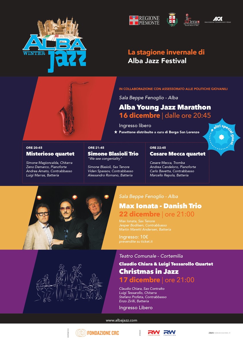 Il 16 dicembre presso la Sala Beppe Fenoglio Alba Jazz Festival sessione invernale organizza in collaborazione con l’assessorato alle politiche giovanili del Comune di Alba La prima rassegna: “Alba young Jazz marathon”. Tre gruppi di giovani artisti (under 30) che si esibiranno uno dopo l’altro, dando vita a uno spettacolo di altissimo contenuto musicale per una serata che si preannuncia energica e coinvolgente!
