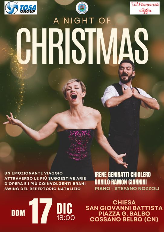 A pochi giorni dal Natale, la Proloco di Cossano Belbo in collaborazione con la TosaGroup SPA e Coop. Carni Vallebelbo organizza il Concerto natalizio "A Night of Christmas" domenica 17 dicembre alle ore 18 presso la chiesa parrocchiale di San Giovanni Battista. Irene Geninatti Chiolero, Danilo Ramon Giannini e Stefano Nozzoli proporranno le più suggestive arie d'opera ed i più coinvolgenti brani swing del repertorio natalizio.