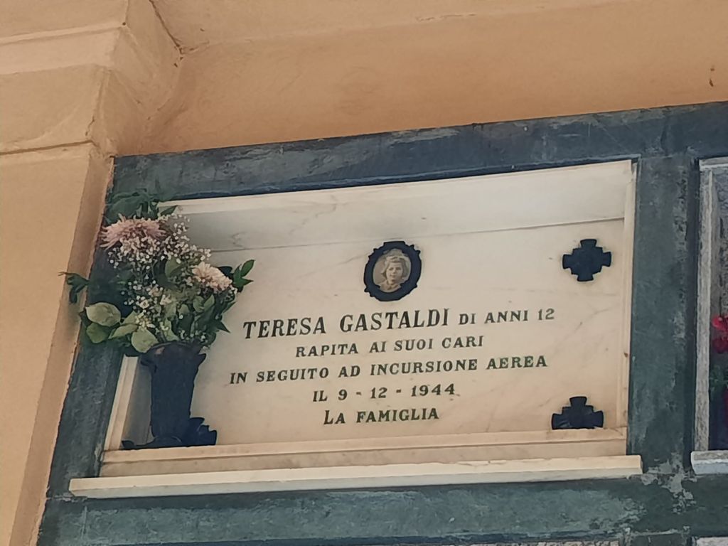 “Qui riposa Teresa Gastaldi, deceduta il 9 dicembre del 1944 a 12 anni causa di un bombardamento aereo. Con lei morirono Giuseppe Elia 65 anni, la figlia Elena 39 anni col marito Giovanni Soardo 38 anni, i loro figli Ugo 8 anni e Bruno 4 anni”.