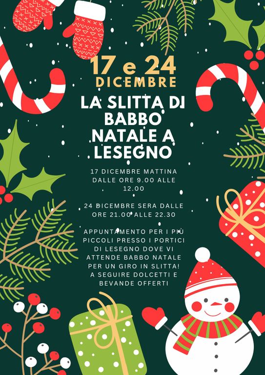 Domenica 24 dicembre, in occasione della Vigilia, dalle 21 alle 22.30 tornerà l’appuntamento per i più piccoli presso i portici dove ad attenderli ci sarà Babbo Natale per un giro in slitta. A seguire verranno distribuiti dolcetti e bevande che saranno offerti, in collaborazione con la pro loco.