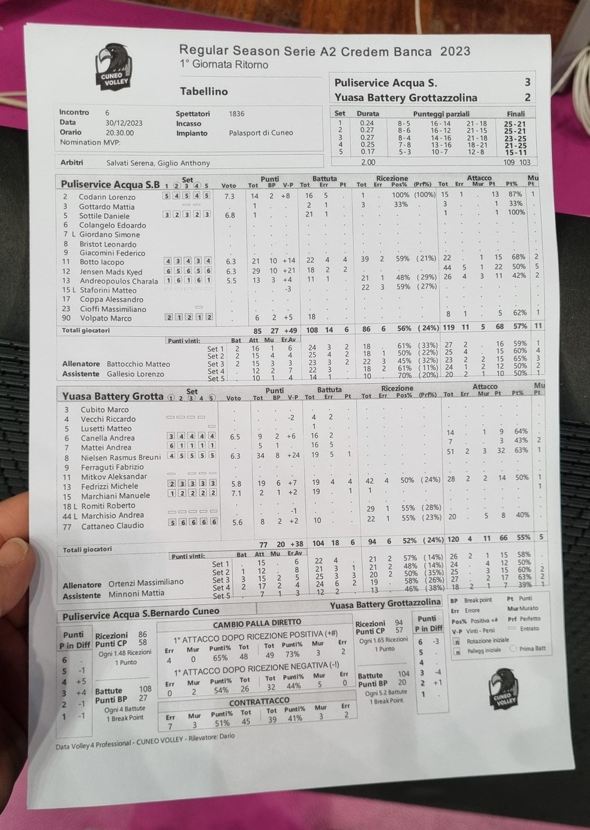 Cresce ancora l'attacco di squadra di Cuneo, che tocca il 65% con Botto al 60% (3 su 5), Jensen al 57% (4 su 7) e Andreopoulos al 50% (3 su 6). Numeri pressoché simili quelli di Grottazzolina (60%), che fa suo il set con il guizzo finale di Fedrizzi.