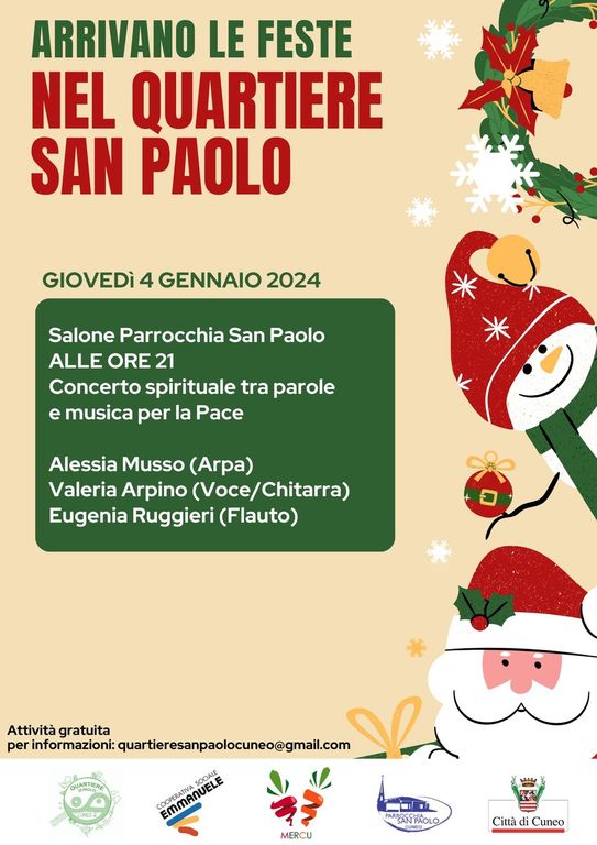 Giovedì 4 Gennaio nel salone Parrocchia San Paolo alle ore 21 un Concerto spirituale tra parole e musica per la Pace con Alessia Musso (Arpa) Valeria Arpino (Voce/Chitarra) ed Eugenia Ruggieri (Flauto).