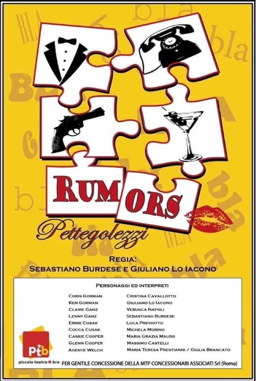 Domenica 25 febbraio dalla penna del grande Neil Simon una commedia esilarante, “Rumors”, messa in scena dal Piccolo Teatro di Bra con la regia di Sebastiano Burdese e Giuliano Lo Iacono: i fatti si svolgono a New York dove quattro coppie di coniugi upper class, invitati a festeggiare l'anniversario di matrimonio del vice sindaco della città, si ritrovano a dover affrontare il tentato omicidio del loro illustre concittadino.