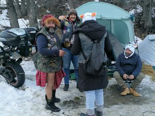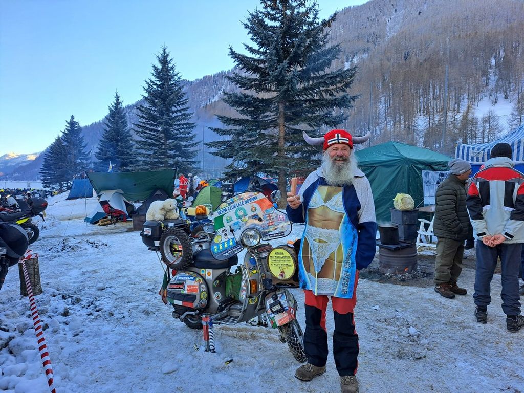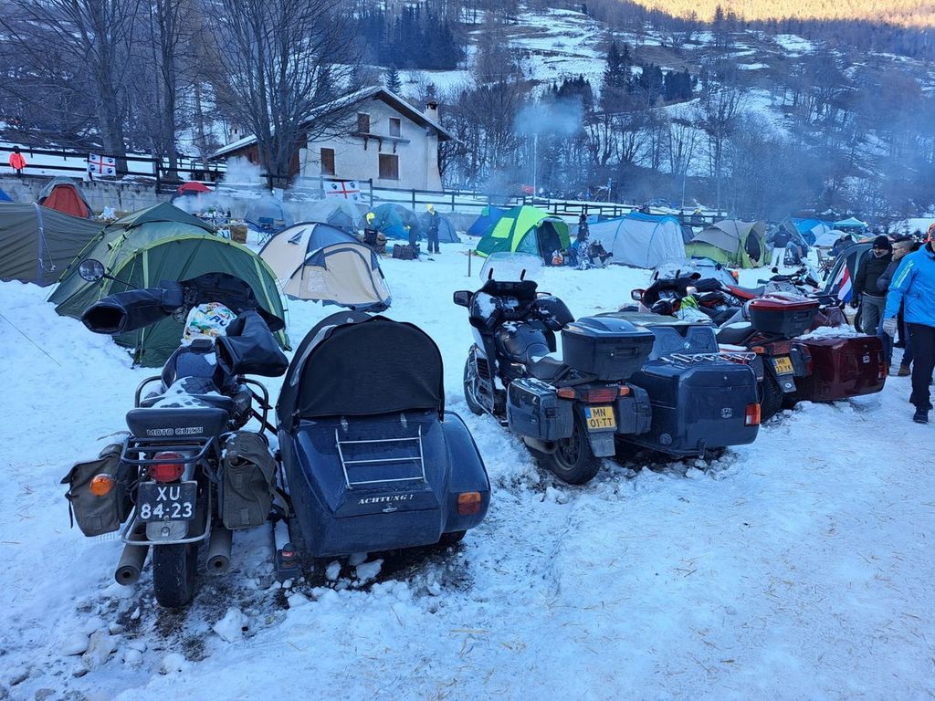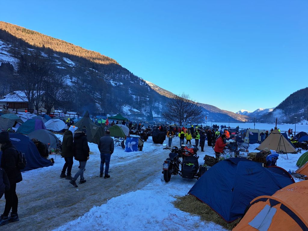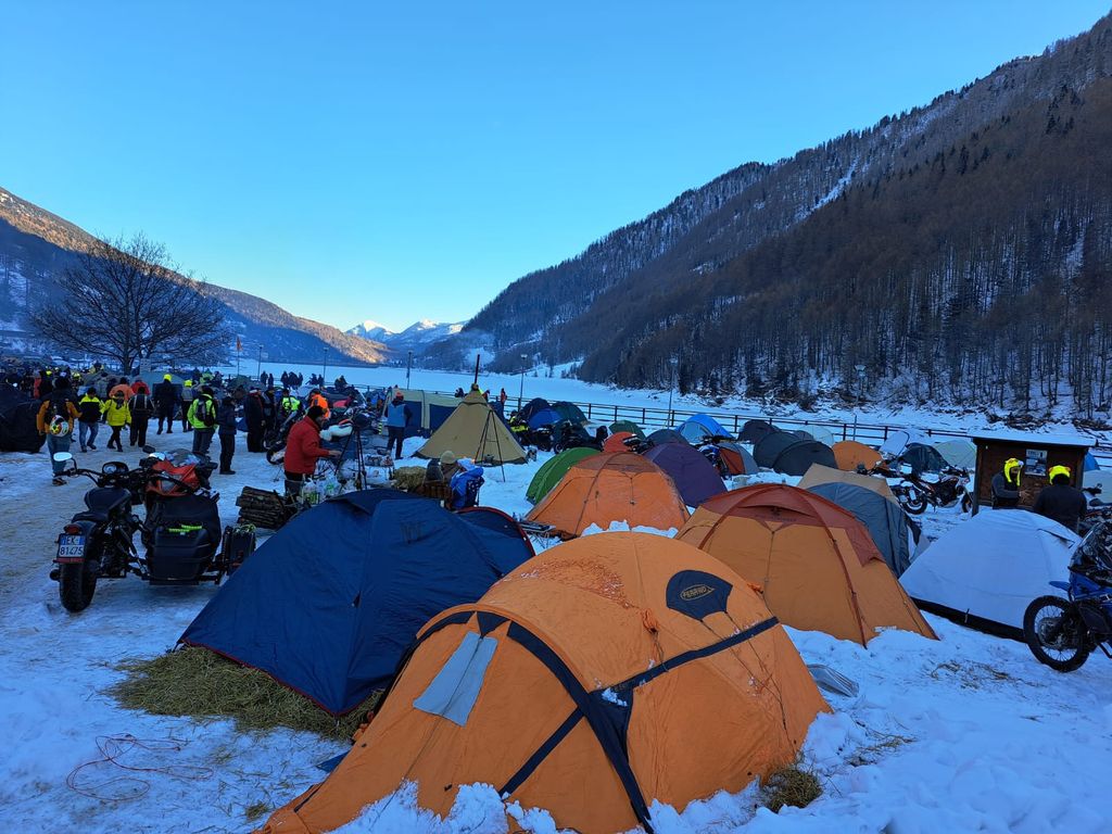 Immancabili poi le migliaia di tende montate sul lungolago attorniato da paglia per attutire il freddo, assieme alle ‘balle di fieno’ che fungono da sedie durante i pasti dove i gruppi di motociclisti si ritrovano attorno al fuoco in maniera conviviale preparando grigliate di carne, innaffiate da vino che serve anche da corroborante per superare il freddo. Durante la notte tra venerdì e sabato c’è anche stata una breve nevicata che ha reso l’atmosfera ancora più avventurosa.